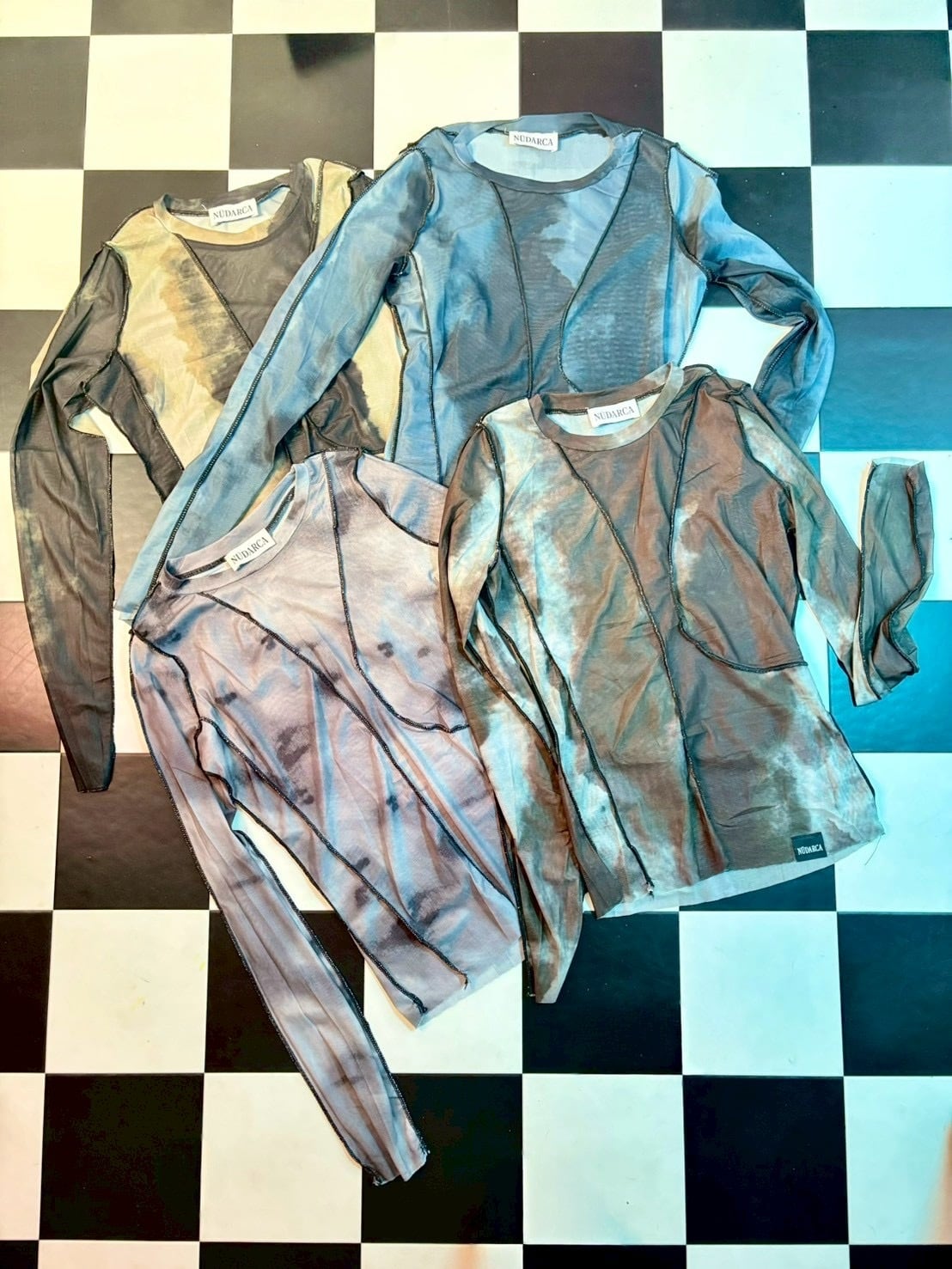 SUNSET VEIL MESH TOP (サンセット・ヴェイル・メッシュトップ) — 夕陽を透かすようなグラデーションと、繊細な透け感を纏うシースルートップ。